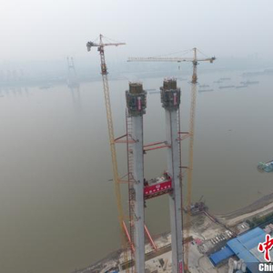 图为,成功封顶的武汉杨泗港长江大桥北岸主塔 张卫东 摄