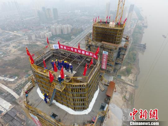 中新网武汉11月21日电 (张静 刘佩娅 胡明杰 徐金波)21日上午,随着建设者们将最后一方混凝土浇筑完毕,武汉杨泗港长江大桥北岸(汉阳岸)主塔成功封顶,标志着由中铁大桥院设计、中铁大桥局施工的世界最大跨度双层悬索桥建成首个主塔。