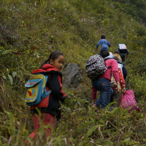 2015年广西启动教育扶贫全覆盖行动,越来越多的山区学生被安置到新建、改建、扩建的寄宿制学校就读。每逢周五和周日下午,在七百弄乡的盘山公路上,准时涌现一股“回家潮”和“返校潮”:一队队背着书包的小学生,周五放学后步行回家,周日又步行返校。