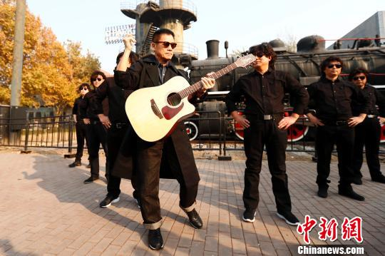 11月21日,火车头广场聚集了一帮青春版“罗大佑”,他们戴着爆炸头假发、穿着黑衣戴着黑墨镜、模仿罗大佑最爱的pose,在火车头前与罗大佑一起街拍。 富田 摄