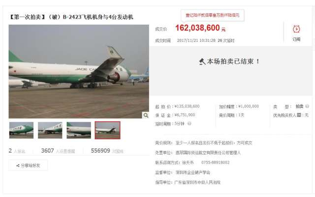 11月20日上午10点,注册号分别为B-2421航空器一架(含3台GE发动机)、B-2422航空器一架(含4台GE发动机)、B-2423航空器一架(含4台GE发动机)的三架波音747货机在网上竞拍开始,起拍价分别为1.226亿元、1.34亿元、1.35亿元。