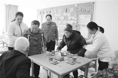 “喘息服务”是通过政府购买社会服务的形式,为失能失智老人家庭提供日常生活短期照料、助浴服务等服务,让家属有机会“喘息”,该社区目前有57位老人可以免费享受该项服务。图为入住的老人正在服务人员的帮助下准备吃“下午茶”。