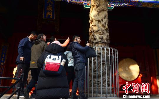 在山东曲阜孔庙,石柱上的传统花纹吸引了华文媒体记者。 郝学娟 摄