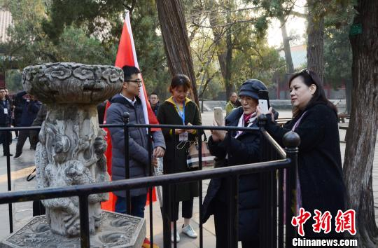 图为华文媒体记者拿起手机拍摄孔庙内文物。 郝学娟 摄