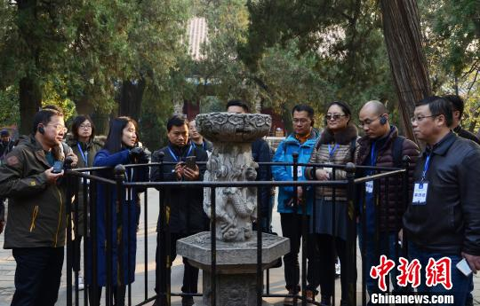 “儒学大赏—首届全球华语广播大型联合采访”活动20日在山东曲阜举行。图为华文媒体记者在观看孔庙内的石刻碑文。 郝学娟 摄