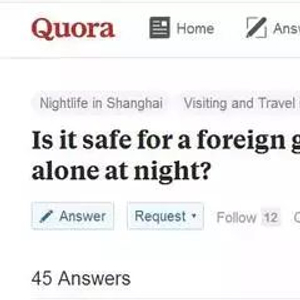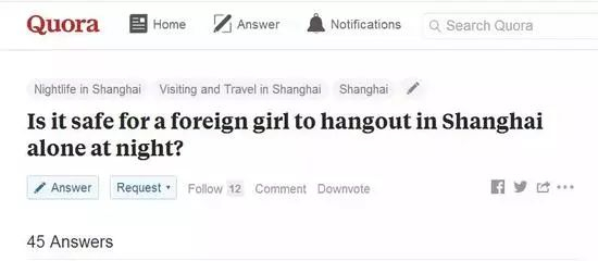 美国版知乎“问与答”上曾有位计划来中国的外国朋友发帖问:对于外国女生来说,晚上一个人在上海街头闲逛是否安全?数十位网友的回答清一色是“当然安全”。