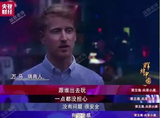 对于中国的安全感,有两位外国小哥曾在央视播出的《辉煌中国》节目中现身说法:“跟谁出去玩,一点都不担心”,“ 中国非常安全,我已经跟父母说我不回去了。”