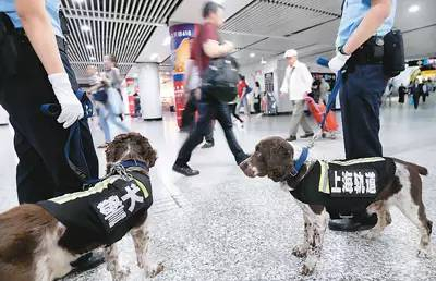 民警携捜爆犬在上海地铁徐家汇站值勤。新华社记者 凡军摄