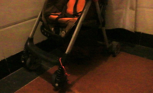 他首先会将儿子连人带车端下楼,然后在妻子的手腕上系一条布绳牵着走。