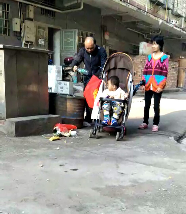 佝偻着身子,左手用一根麻绳牵着妻子,右手推着一辆破旧的儿童推车,里面坐着2岁的轩轩。每经过一个垃圾堆,他都会驻足,然后在堆里捣鼓一番,这是谭湘平每天的日常生活。