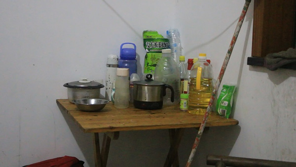 一张放着被子的小床,几个小板凳,一张放着油盐酱醋的桌子。桌子上有一个电磁炉,地下放着两个电饭煲,其中一个,已经坏了。屋中放置一个小推车,衣柜放在小床的一侧,旁边堆满了杂物。
