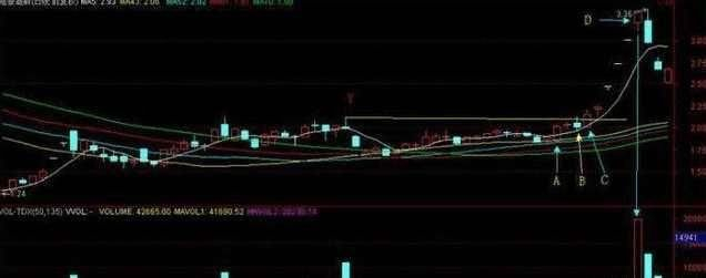 股价经过较长时间小阴线、小阳线的横向整理,5、10、20日均线几乎处于粘合状态,突然一根超过5%的放量长阳突破三条均线,并创新阶段高点,基本就可以认定为蛟龙出海之势。一般,当出现蛟龙出海之势后,股价回撤至出海阳线的1/3处或者1/2处为最佳抄底机会,后面将迎来可观的涨幅。一般来说,蛟龙出海后面的上涨空间和横向整理的时间成正比。有一点需要注意的是,蛟龙出海一定要与量价配合,量能最好能够较前几日放大2-3倍为好,否则会有假出海诱多的嫌疑。
