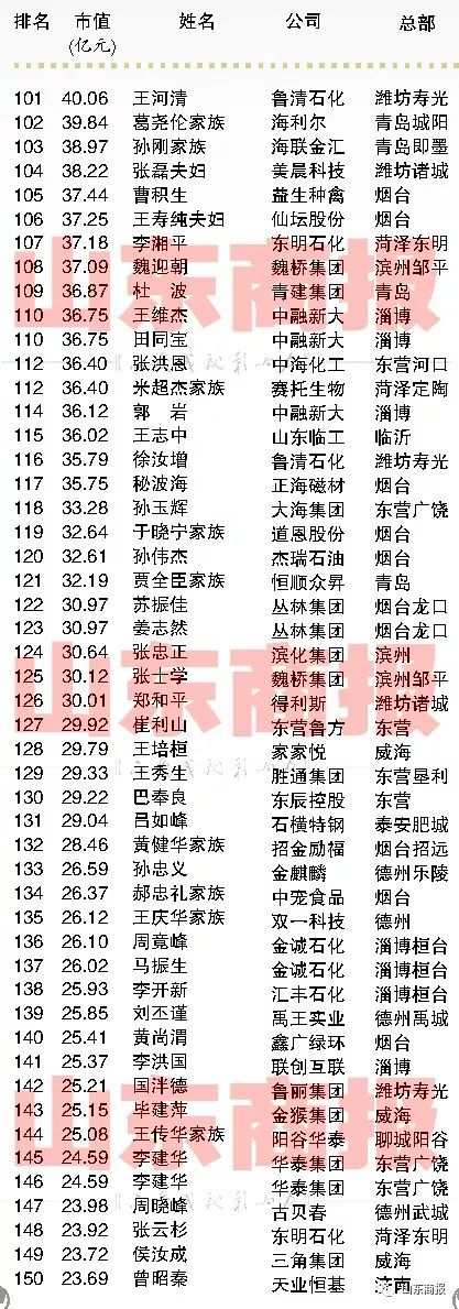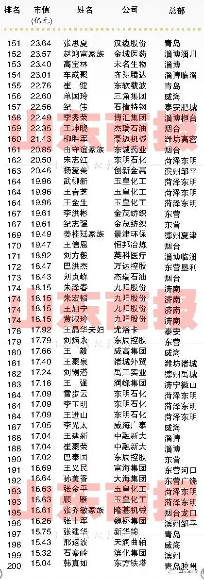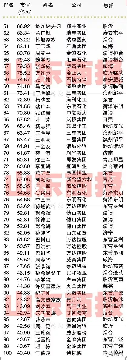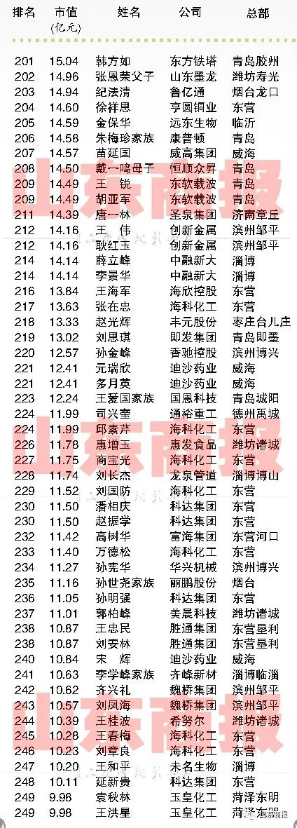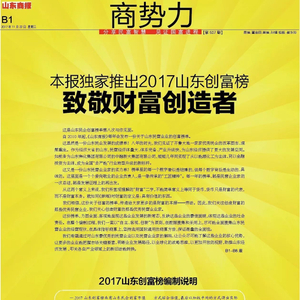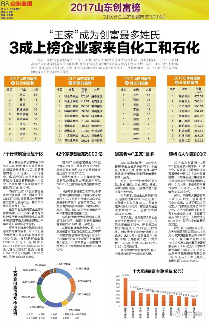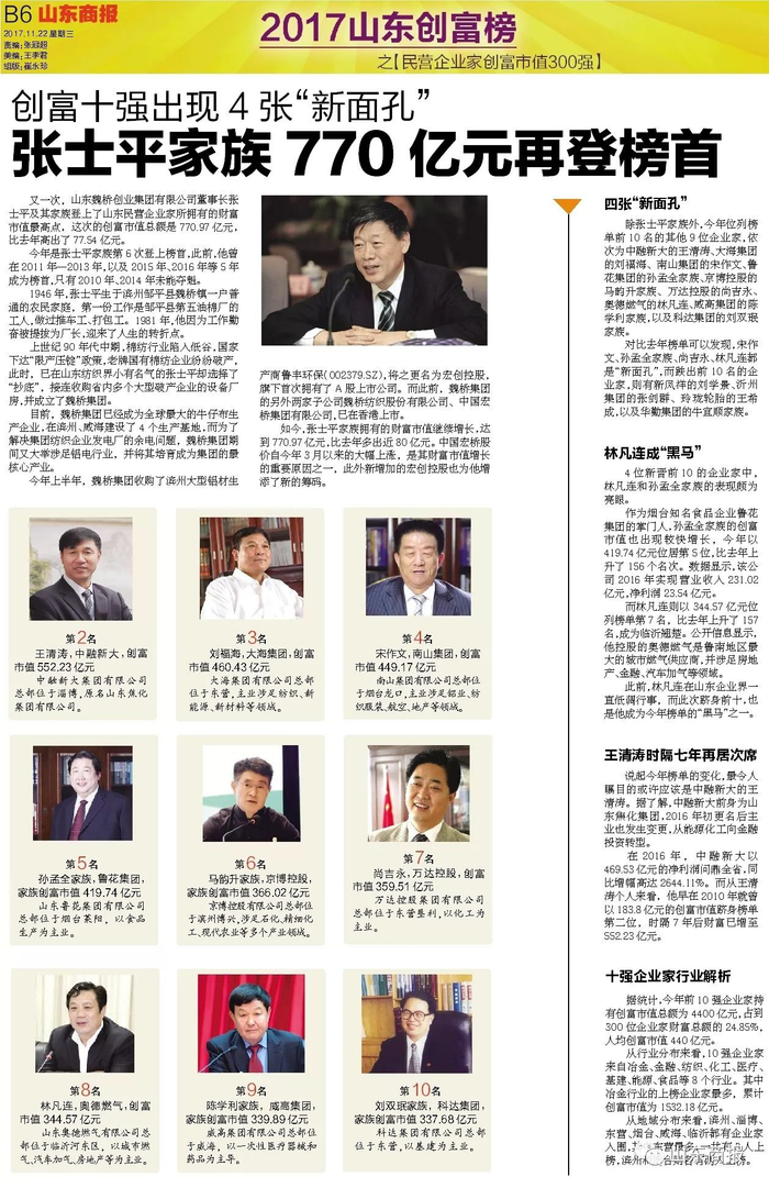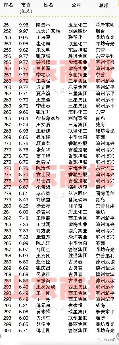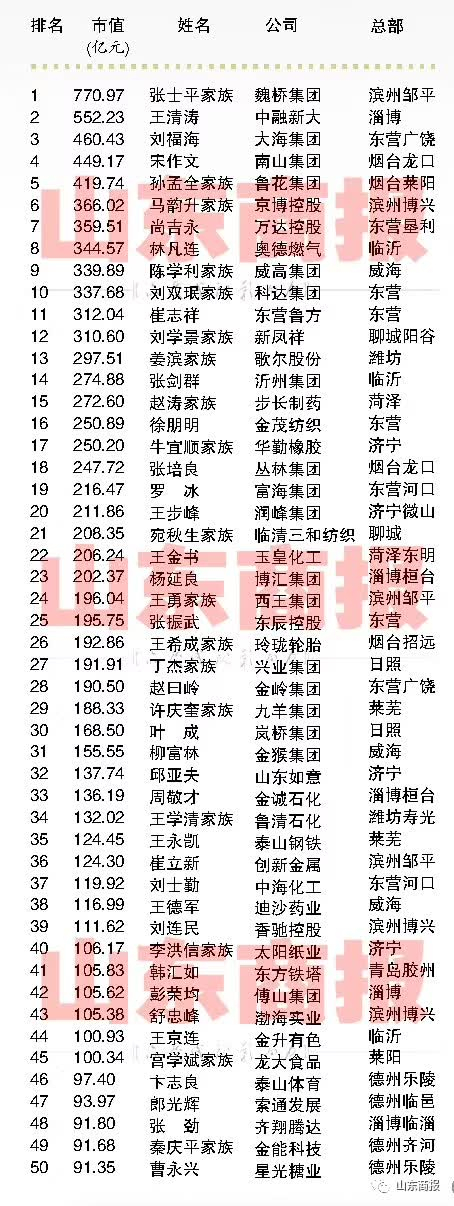 2017山东创富榜来了!这300人是山东最能创造财富的民营企业家!【山东商报】 山东商报 2017.11.2207:37 关注 山东民营企业家创富市值300强声明:本榜单由山东商报独家编制,如需转载,请勿擅自修改标题和内容。山东商报新媒体记者 孙 珂 张冠超 高玲 董金丽 徐晓阳见习记者 刘东宁山东商报新媒体编辑 崔妮娜