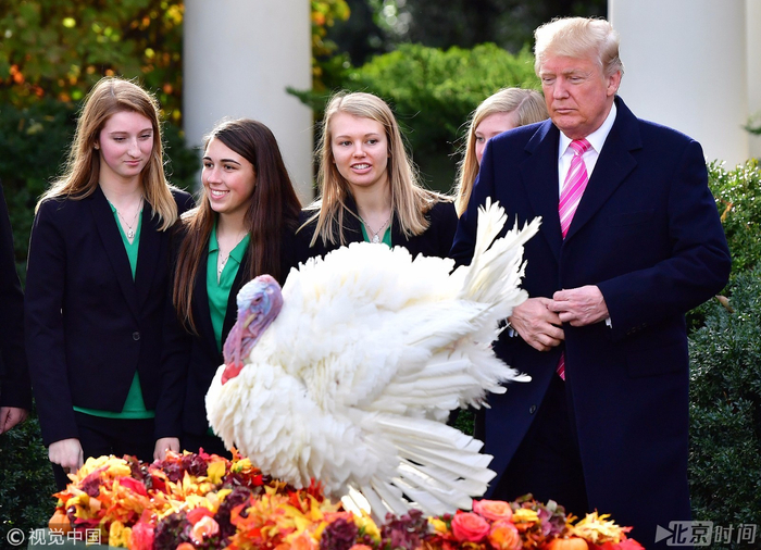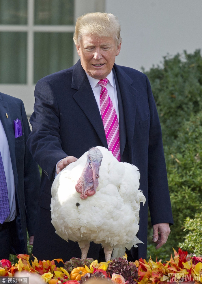 11月21日,在美国华盛顿白宫玫瑰园,美国总统特朗普参加火鸡“赦免”仪式。被“赦免”的火鸡将免于像其他同伴那样成为人们感恩节餐桌上的美味烤火鸡。据CNN报道,特朗普抚摸着36磅重的火鸡说,“这是一只大鸟……哇!我对自己感觉很好。……你准备好了么,鼓槌(Drumstick,火鸡的名字)?好,鼓槌,你得到赦免。”而去年被赦免的火鸡Tater 和 Tot都仍然安全地活着。