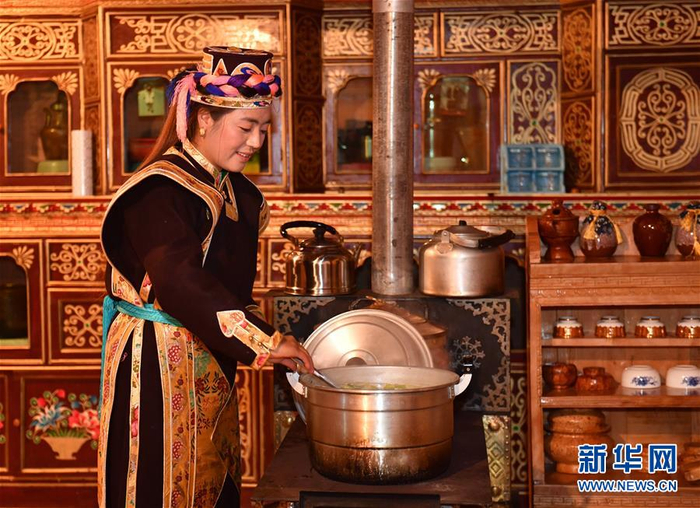 林芝市米林县派镇妇女拉姆身着工布服饰做晚饭(11月17日摄)。