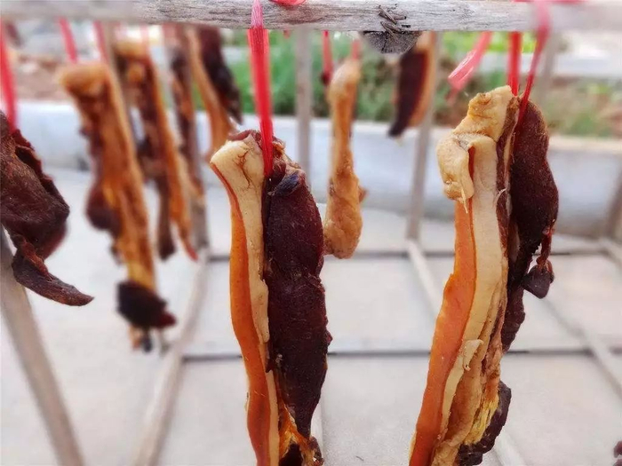 7天之后,把肉拿出来用刀尖将肉块一端的肉皮部位刺穿,并用麻绳结套拴扣,再把肉块挂在有阳光并且通风的地方,充分晾晒3至5天。北方气候干燥、日照充沛,晾晒3天即可,南方空气较湿润可多晾晒一两天,总之要将肉里水分晾干。至此,腌制任务就大功告成了。