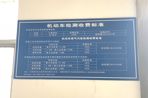11月20日早上,澎湃新闻来到东湖高新驿安机动车检测站,办事大厅的墙上,对收费标准进行了公示,其中“机动车安全技术检验收费标准”为100元,依据鄂价费【2014】21号文件。轻型车辆排气污染检测收费标准为60元,依据武价费【2014】44号文件。