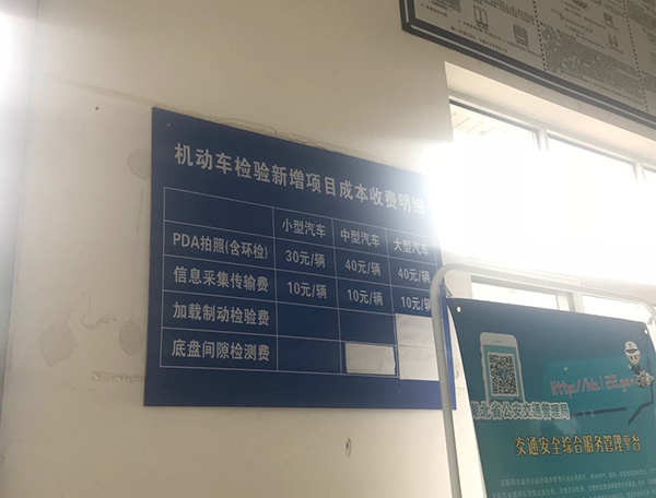 在马湖同好机动车检测站,澎湃新闻看到,该站张贴了新增项目成本收费明细,PDA拍照费30元/辆,信息采集传输费10元/辆。