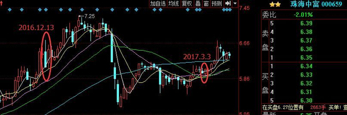 2016.12.13的珠海中富(000659),如图前一日股价高开低走,留下一根不短的上影线,若光由这一根线那么直接会判断为多方势力被打压,但13号当日股价回踩10日线收阳,两根K线组合正好满足“旭日东升”的特征——大阴大阳且阳线收盘价高于阴线开盘价,可以看到后市该股又进行了一波拉升。