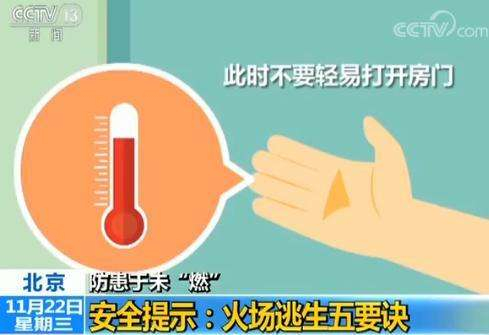 开门逃生前,应该先用手触摸房门,如果房门变热,则不能轻易打开,否则烟和火就会直接冲入室内。要马上选择一个暂时避险的地方,最好是有水源,靠近窗口,用湿床单封堵门缝,延缓烟气蔓延。不要贸然打开门窗,有毒烟气会迅速进入房间,也会造成火势迅速向房间内蔓延;