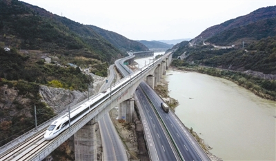 过了江油站,列车驶上西成高铁的新建线路,经停江油北站、剑门关站,10点36分抵达广元站,车窗外的风景渐渐从平坦的林盘变成了参差错落的群山。从广元站开出不到3分钟,列车来到广元嘉陵江特大桥上,行进的方向一侧就是川北著名的“千佛崖”景区,坐在高速行驶的动车组上,也可将悬崖峭壁上的景象尽收眼底。