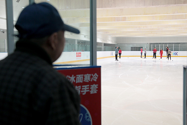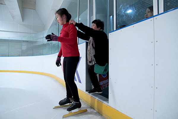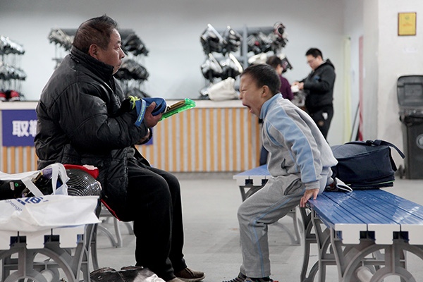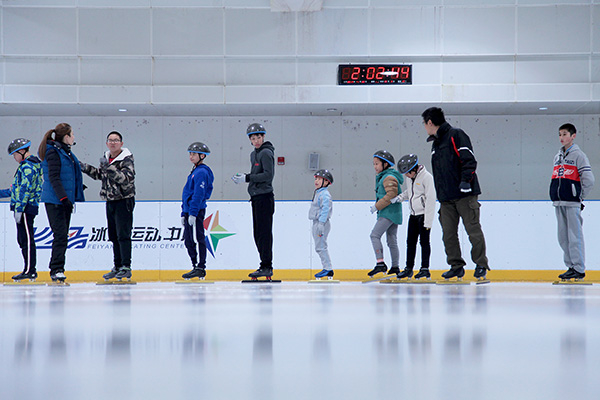 在冰场教练李秀明的带领和辅读学校赵欣华老师的陪伴下,孩子们鱼贯而入地进入冰场,开始了他们的日常训练,在冰场外还有守候着他们的家长。