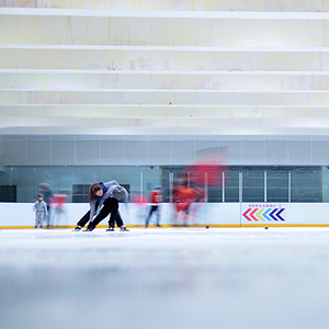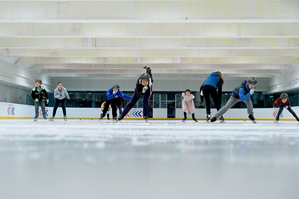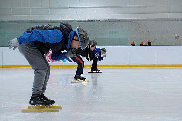 离下午2点开始上课还有半个多小时,孩子便来到冰场开始换装和进行准备活动。他们坐在板凳上换好厚实的衣服、穿上冰刀,脸上挂着开心的笑容。