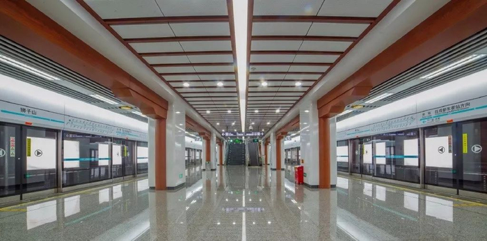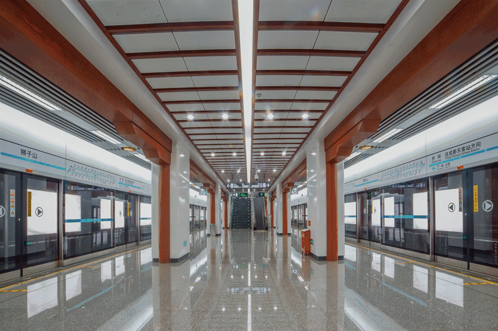 狮子山站靠近菱窠故居,故在空间装饰设计上,个性区天花结合建筑结构特点,呈现出典型的川西民居房顶造型;柱头顶部以菱窠故居木质连廊为造型元素,在充分表达地域文化特色的同时,也注重空间通透性的氛围营造。