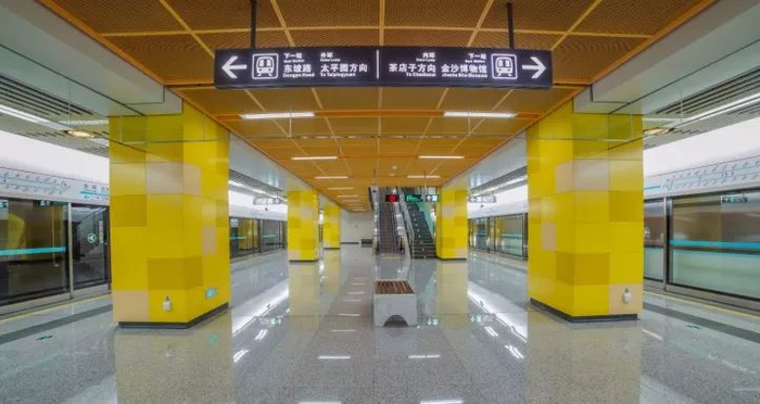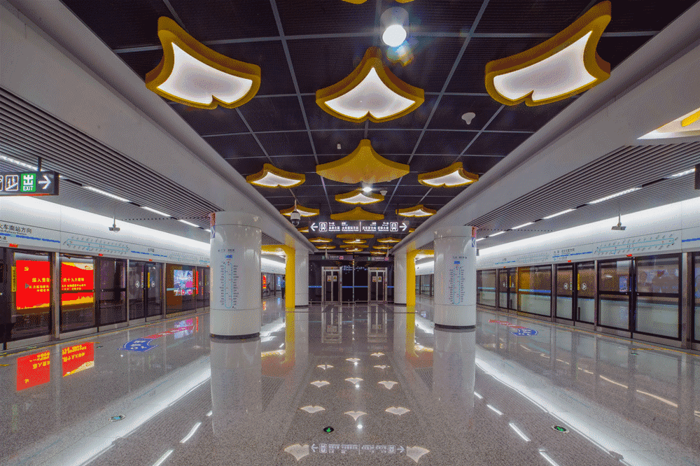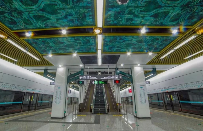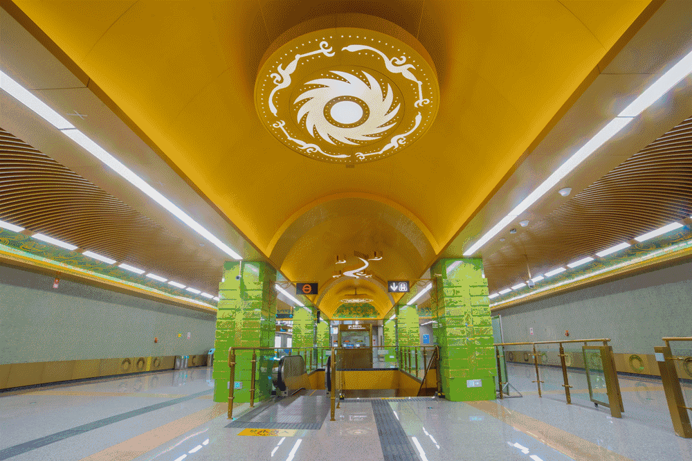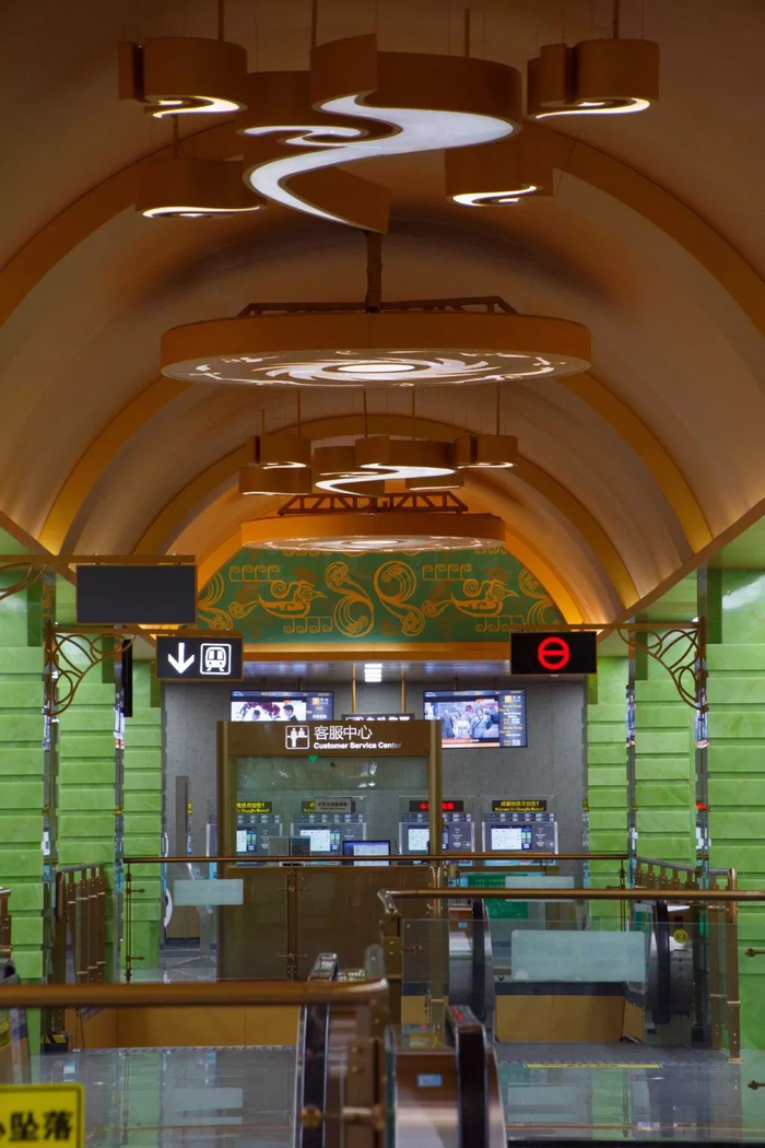 该站装修方案充分结合金沙文化独有的视觉元素,打造出金碧辉煌的空间氛围,映射出古蜀人在浩瀚的人类文明发展史中做出的卓越贡献。
