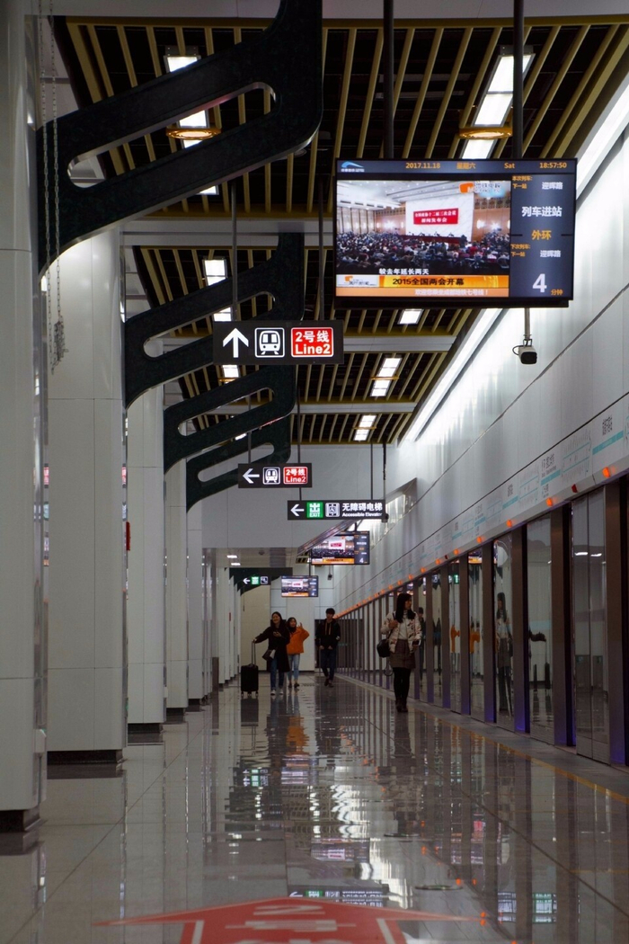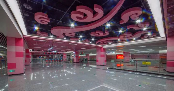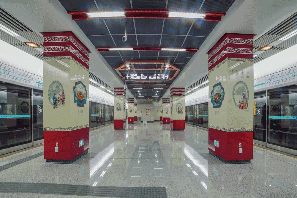 该站与2号线换乘,地处成都美食一条街,故在装修设计上以筷子为设计语言,柱面以特色美食为创作元素,同时在站台个性区加入了具有浓郁地方特色的火锅九宫格造型,强化了文化属性,让五湖四海的乘客在领略独具魅力的川味美食的同时,也能了解到这些川菜的发展与由来。