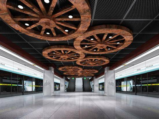 站台层天花重点在个性区进行文化表现,在顶面饰以具有代表性的马车车轮艺术造型,创意于汉代蜀郡代表作家司马相如“不乘高车驷马,不过汝下”之典故而来;柱面顶部借鉴汉阙造型,刻画出浓郁的汉代建筑风格,柱面图案以驷马高车为创作背景,通过石材雕刻的艺术手法,辅以我国古代祥云元素将汉代高车的形象刻画的淋漓尽致,并依托驷马桥来表达司马相如的心存志高与旷世才华。