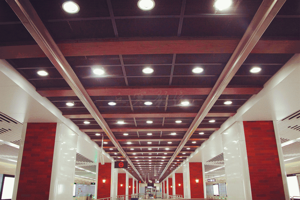 四个区段从大的装饰层面统一各站色调,柱面、墙面、个性区天花色彩相互呼应,通过太阳神鸟的造型灯具以及祥云图案做为共性文化元素贯穿全线共性区天花,地面铺装则采用常规的白麻花岗岩,注重美观性和实用性。