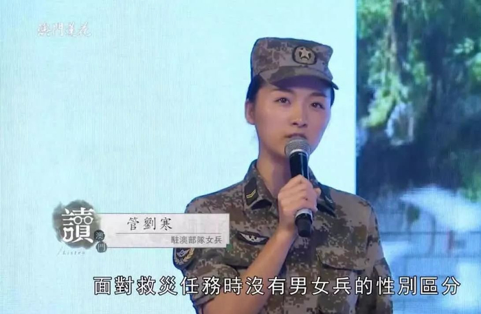 “我们驻澳门部队无论男兵女兵,都是普通的一兵。面对救灾任务时,没有男女兵的性别区分,像在救灾现场清理街道、搬运垃圾这些工作,我们女兵也一样都抢着干。”在《读澳门》节目现场,被网友赞为“最美女兵”管刘寒的一段告白,令现场观众对这位人美心善的大学生士兵竖起大拇指。节目中,管刘寒分享了一段感动记忆:记得有个小女孩来给我们送水,她就一直拎着水站在我们旁边,就那么一直站着,直到我们稍作停顿的时候,她才怯生生地走上来说:“各位姐姐,请喝水”。本来我们是要婉言谢绝的,但是看到她被袋子勒得发白的小手,我们接受了馈赠,从来没有想过矿泉水也会那么甜。