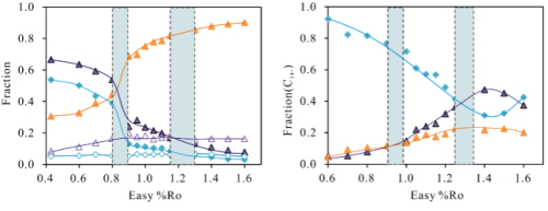 中国科学院广州地球化学研究所有机地球化学国家重点实验彭平安学科组,通过黄金管高温高压封闭体系模拟实验及13C DP/MAS核磁共振分析技术,对生油窗范围内茂名油页岩I型干酪根的结构变化开展了深入研究,并在干酪根分子结构模型建立方面取得进展。研究发现,茂名油页岩干酪根结构出现两次跃变,分别为Easy%Ro 0.80-0.90和Easy%Ro 1.15-1.25之间,对应生油高峰期及生油窗末期。茂名油页岩I型干酪根的芳碳率与成熟度存在三段式非线性正相关关系,在Easy%Ro 0.80-0.90区间芳碳率出现陡升现象。生油高峰前脂碳结构持续大量断裂,并在Easy%Ro 0.80-0.90区间脂碳结构由干酪根主要结构变为次要结构,导致芳碳率陡升,这是近年来关于生油窗内干酪根结构模型定量表征及变化分析的首次报道。该研究建立的茂名油页岩I型干酪根及4个生油窗范围内的干酪根分子结构模型,提供了干酪根在热演化过程中化学结构新的研究方法。