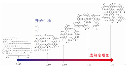 图2.茂名油页岩I型干酪根分子结构随成熟度的变化