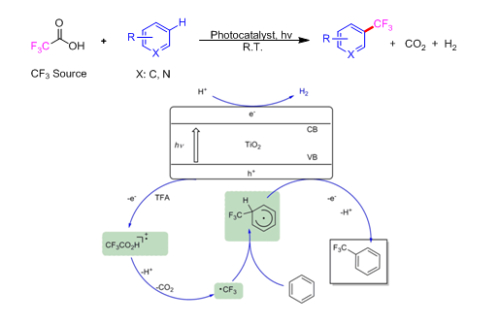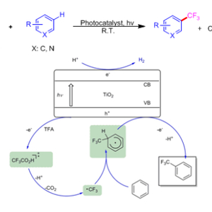 中国科学院福建物质结构研究所研究员苏伟平与清华大学李亚栋研究团队合作,研究出一种温和高效的Rh/TiO2光催化体系,实现了室温条件下光诱导的三氟乙酸脱羧/芳香烃C-H键直接三氟甲基化反应。该成果使用廉价的三氟乙酸作三氟甲基试剂,清洁的光作能源,无毒环保的二氧化钛作光催化剂,在室温条件下将三氟甲基引入芳香烃。同时,研究人员提出了全新的反应机理。催化循环无外加氧化剂参与,反应体系中的质子充当氧化剂生成氢气,展示出光催化在无需外加氧化剂条件下C-H键直接官能团化过程中的独特潜质,真正达到原子经济性的要求。该反应的底物范围还可以延伸至吡啶、嘧啶等含氮杂环以及具有生物活性的咖啡因、茶碱等黄嘌呤结构化合物当中。