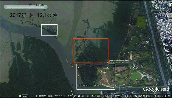 从红树林眺望深圳湾,远处小岛状的树丛就是野蛮生长的外来物种无瓣海桑