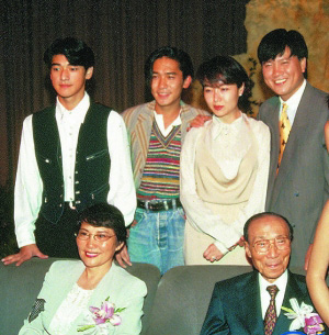 方逸华和邵逸夫的邵氏电影捧出众多巨星。图为邵逸夫、方逸华和金城武、梁朝伟、恬妞、万梓良合影。资料图