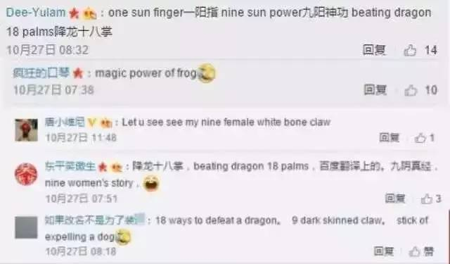 Holmwood说的没错,一些已经坐不住的网友跃跃欲试,对金庸的武功招式进行了各种花式“试水翻译”……其中包括,九阳神功 nine mans power (九个男人的力量,强!)九阴真经 nine woman story (九个女人的故事,有点乱。)