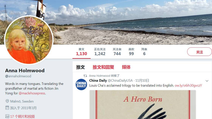在译者 Anna Holmwood推特的首页,CD君(ID: chinadailywx)发现,最近的一条推文是转自《中国日报》,内容是对她以及英译版《射雕英雄传》第一卷的报道。