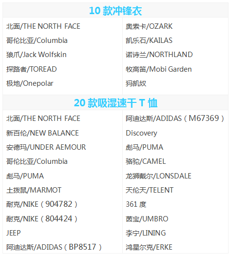 根据广东省消委会与佛山市消委会联合发布的《冲锋衣、吸湿速干T恤比较试验总结报告》被“测评”的品牌包括: