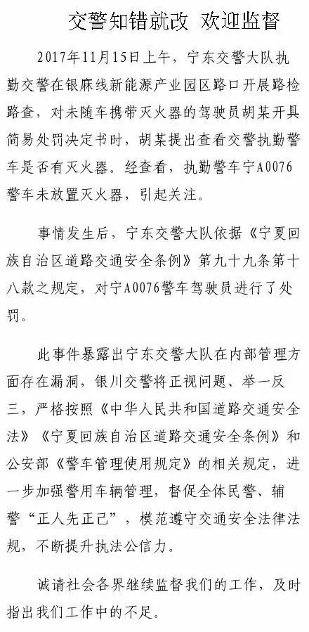 11月16日,宁东交警大队依据《宁夏回族自治区道路交通安全条例》第九十九条第十八款之规定,对宁A0076警车驾驶员进行了处罚。