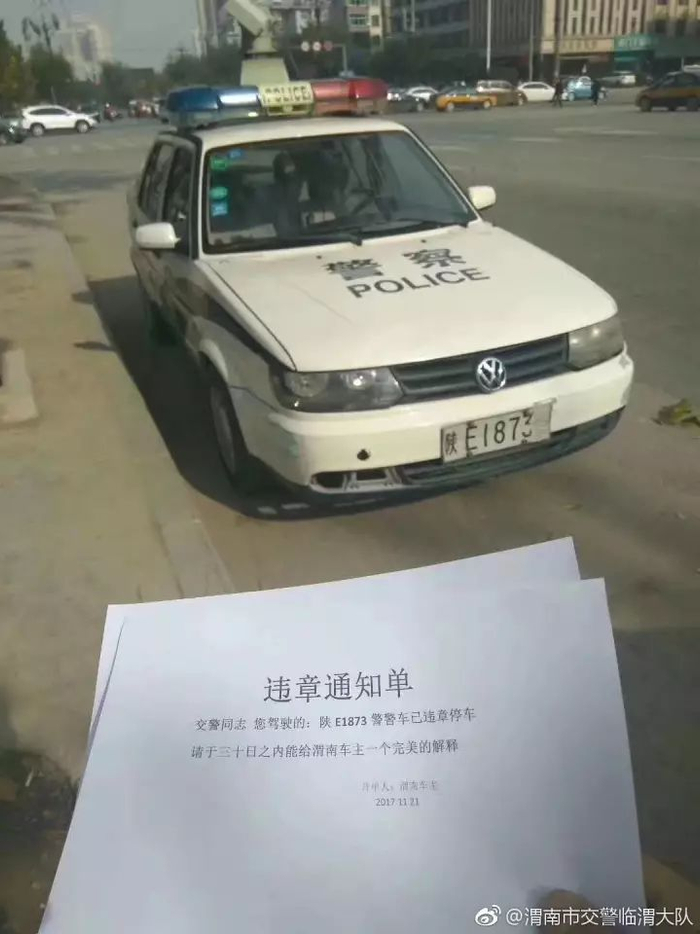 交警同志,您驾驶的“陕E1873警”警车已违章停车,请于三十日之内能给渭南车主一个完美的解释。落款是“开单人:渭南车主”,时间为“2017.11.21”。
