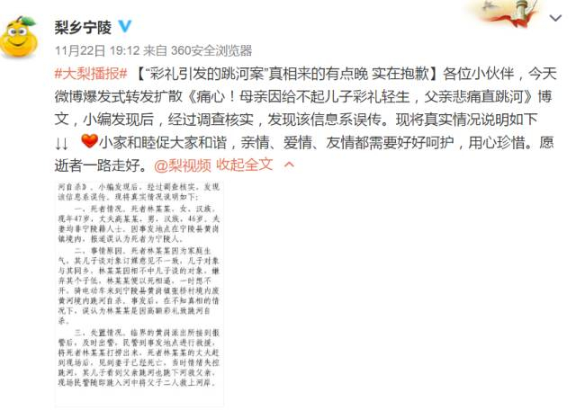 来源:辽沈晚报(lswbwx)、河南省商丘市宁陵县宣传部官方微博@梨乡宁陵、北京青年报、中国青年报、梨视频、新浪微博、桂林晚报、重庆晨报等