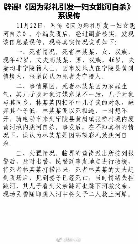 11月22日下午,河南宁陵县宣传部发通报回应此事,称网传说法不实。通报称,死者林某某因为其儿子谈对象订媒意见不一致,儿子对象与其同乡,林某某因相不中儿子谈的对象,嫌弃其个子低,林某某便以死相逼,一时想不开,骑电动车来到宁陵县黄岗镇张桥村境内废黄河境内跳河自杀。事发后,在不知真相的情况下,误认为林某某是因为高额彩礼致跳河自杀。