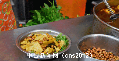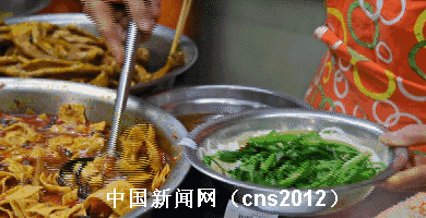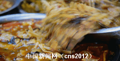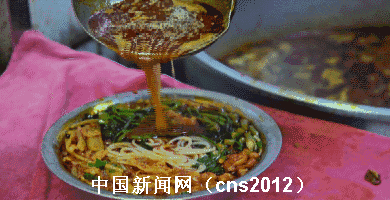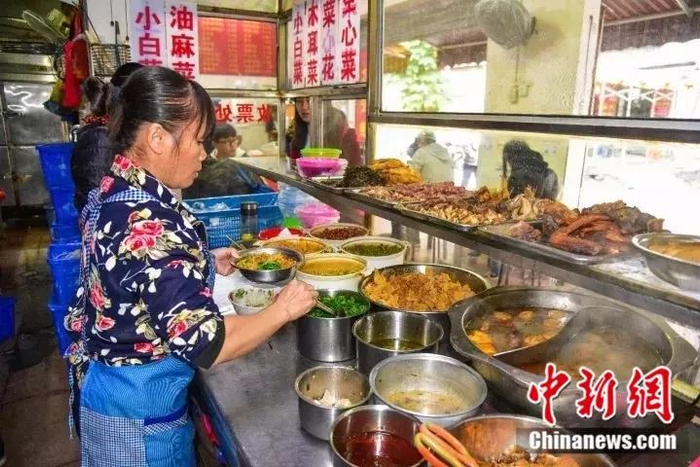 凤张螺蛳粉店的工作人员在给客人打粉。