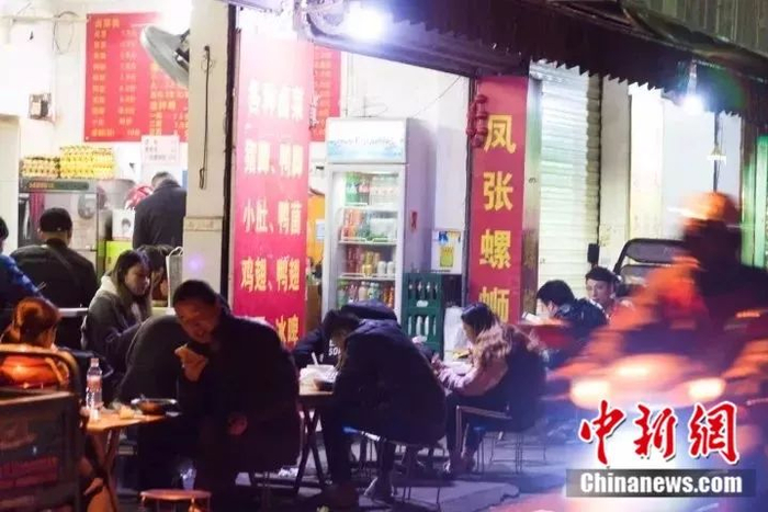 “街边小桌配矮凳,螺蛳粉摊热腾腾;男女围坐来吃粉,汗流浃背喊爽神。”