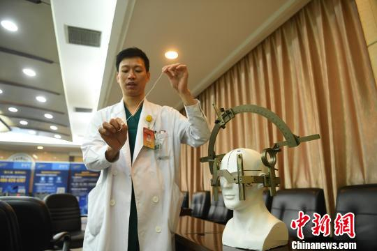 图为神经外科医生钟泽其利用石膏模特进行演示手术过程。 陈超 摄