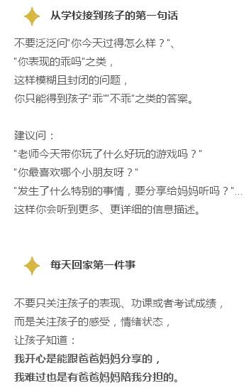 这点十分重要!家长们一定不要向孩子灌输“老师的话一定是对的”、“老师的话一定要听”的错误思想。平常,妈妈们应该通过故事、绘本等物品教育孩子学会保护自己。在幼儿园受到欺负,回家后要及时告知爸爸妈妈。如果受到老师的打骂,也不能立即反抗,这样只会让老师变本加厉。此时应该“委曲求全”,告诉园长或者等回家后再向妈妈“告状”。