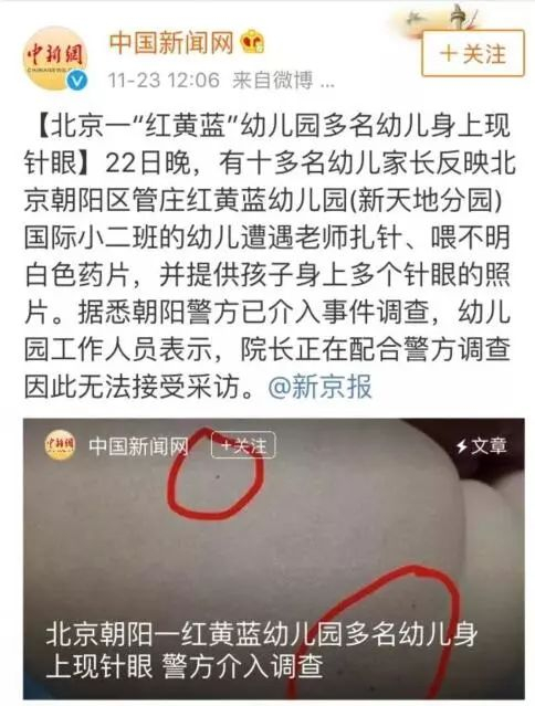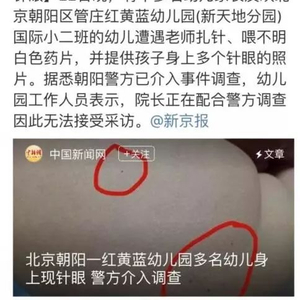近日,多名幼儿家长爆料,北京朝阳区管庄红黄蓝幼儿园(新天地分园)老师对学生扎针、喂药片,且身上有针眼。